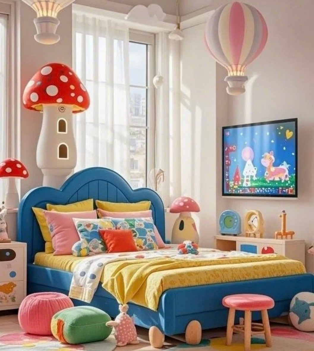 Create a magical and vibrant retreat for your child with this colorful kids bed featuring whimsical cartoon mushroom decor. The eye-catching blue bed frame is paired with playful bedding in bright yellow, pink, and green, instantly energizing any children’s bedroom. Surrounded by oversized mushroom lamps, plush cushions, and hot air balloon lights, this fantasy-themed room inspires imagination and joy. The sturdy, child-friendly bed is designed for comfort and safety, making it perfect for toddlers and young children. Ample space around the bed allows for play and learning, while the lively decor transforms bedtime into an adventure. Ideal for parents seeking a creative and functional space, this fantasy kids bedroom set blends fun, comfort, and style for unforgettable childhood memories.