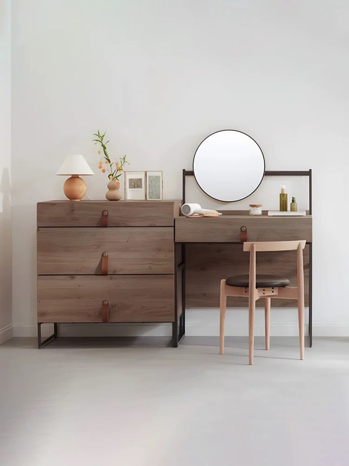 Upgrade your bedroom with this Minimalist Wood Vanity and Dresser Set. Crafted in a Scandinavian-inspired style, this set features wide, deep drawers with leather pull handles, a sleek vanity desk with a round mirror, and a matching wooden chair. The clean lines and natural wood finish blend seamlessly with modern and classic interiors alike. Ideal for teens and adults, this set offers stylish storage for cosmetics, accessories, and everyday essentials.