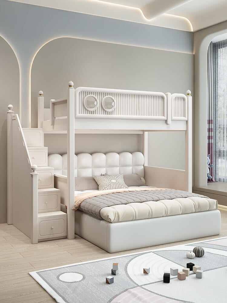The upper bunk is safely enclosed with high rails and accessed via a secure ladder, while the lower full-sized bed features a plush, tufted headboard for cozy lounging or restful sleep. Integrated open storage shelves provide the perfect spot for books, toys, and décor, making this bed both beautiful and practical.