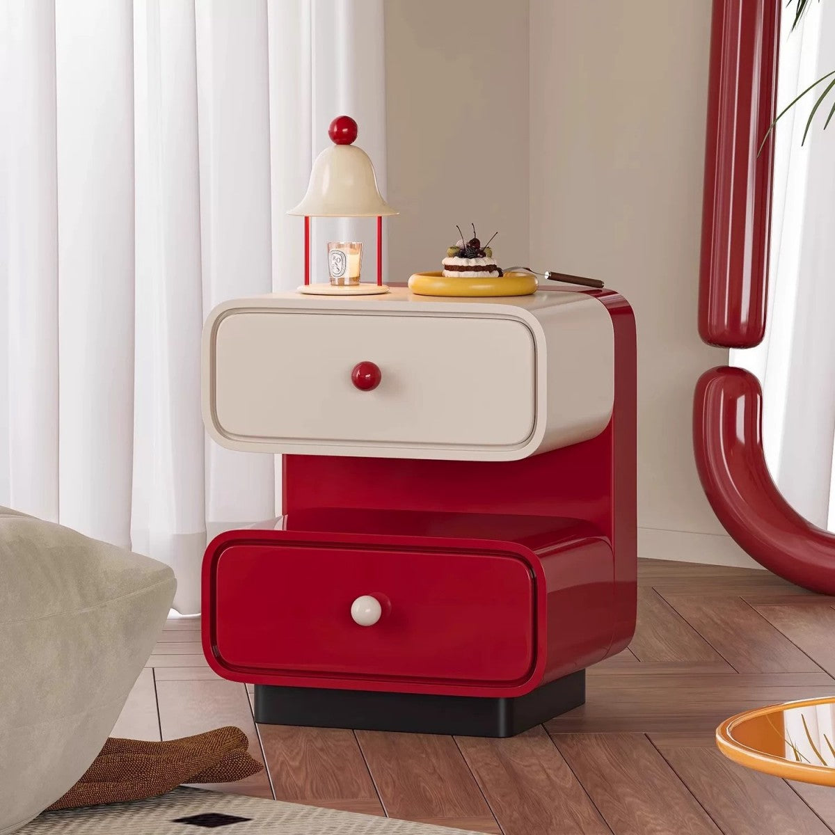 Add a pop of color and style to your bedroom with this Modern Red and White Nightstand. Featuring a bold retro design with rounded edges, glossy red and creamy white drawers, and playful knob details, this bedside cabinet is as functional as it is eye-catching. The spacious drawers provide ample storage for your nighttime essentials, while the smooth tabletop is perfect for a lamp, books, or decor. Constructed from durable materials, this nightstand combines vintage charm with modern practicality—ideal for kids’ rooms, guest bedrooms, or anyone who loves statement furniture.