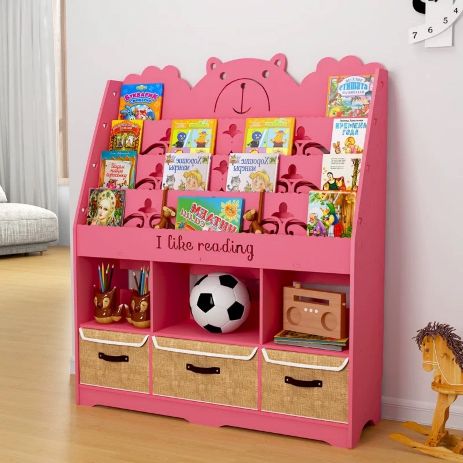 Pink Bear Kids Bookshelf with Storage Bins – Cute Reading Organizer