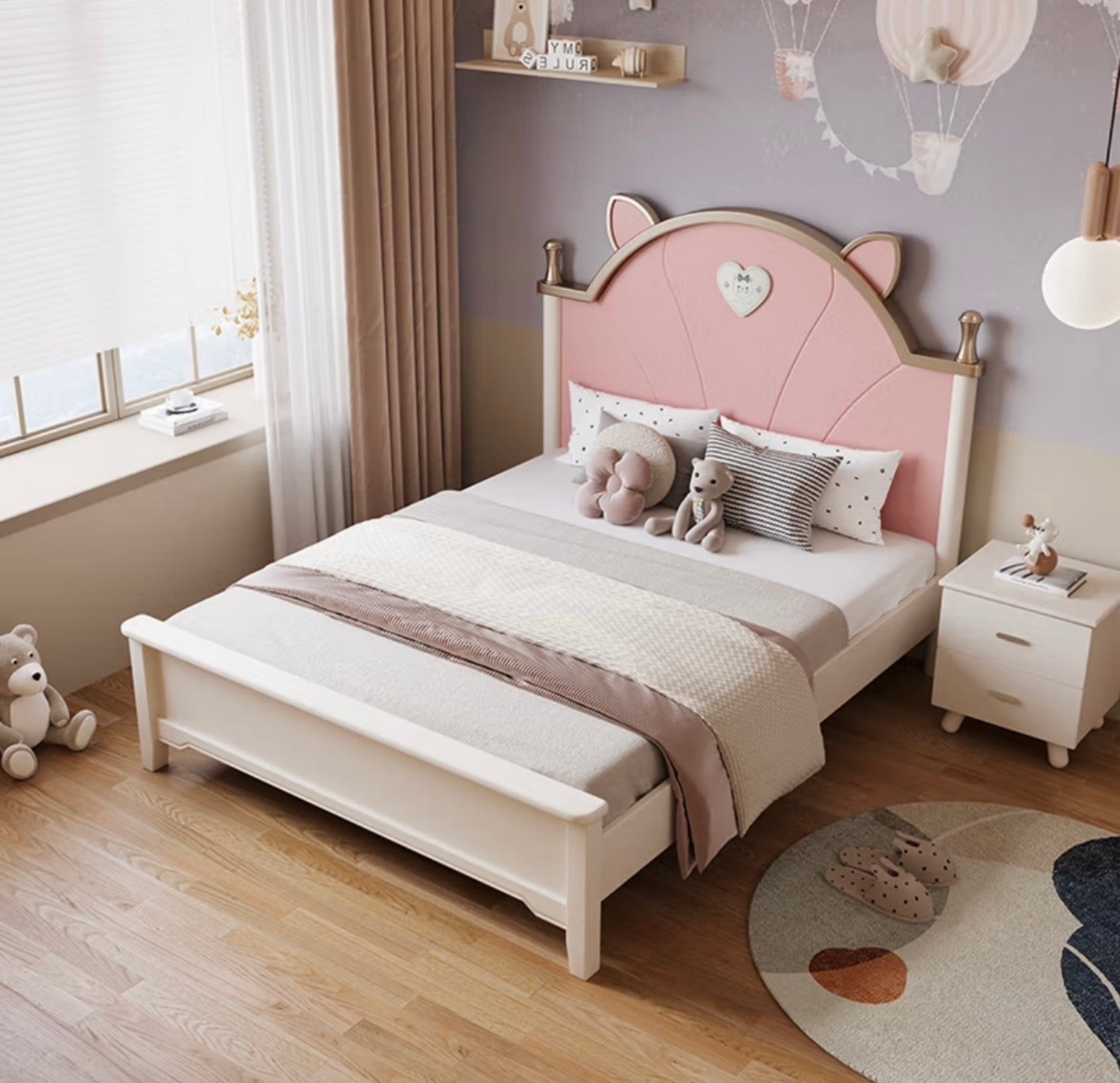 Make bedtime adorable with this Pink Cat Ear Kids Bed. Featuring a soft pink upholstered headboard with playful cat ear details and golden finials, this bed brings charm and whimsy to any girl’s bedroom. The sturdy wooden frame ensures lasting comfort, while the stylish design blends easily with modern or classic décor. Perfect for toddlers to tweens, it’s an enchanting centerpiece for a cozy, creative, and loving sleep space.
