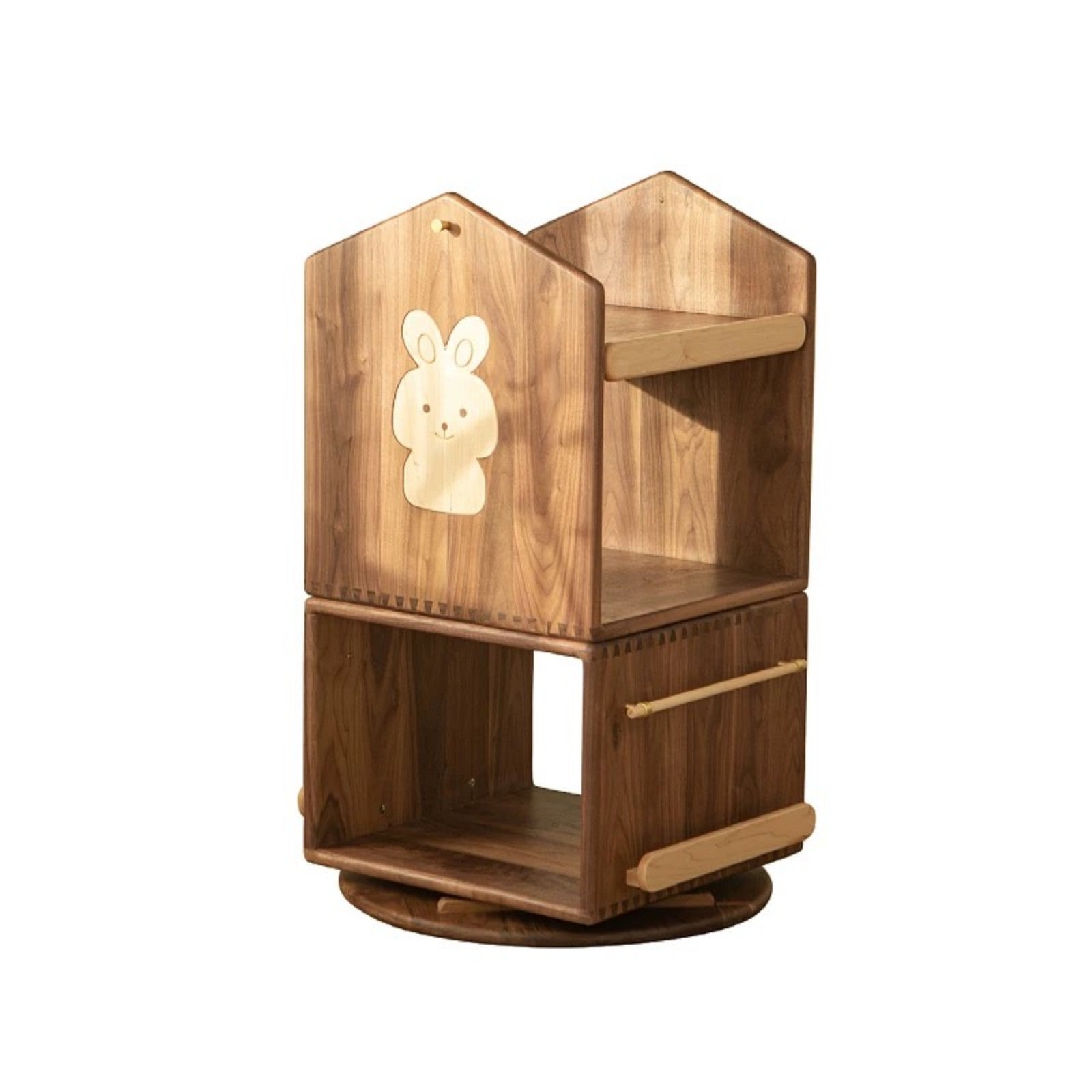 Make story time fun and accessible with this Rotating Wooden Kids Bookshelf featuring a cute bunny motif. Crafted from solid wood with a smooth walnut finish, this 360-degree spinning shelf offers multiple compartments for books, toys, and art supplies. The whimsical house-shaped silhouette and animal detail make it a delightful addition to nurseries, playrooms, and reading corners. Its sturdy construction and functional design encourage kids to keep their space neat and organized.