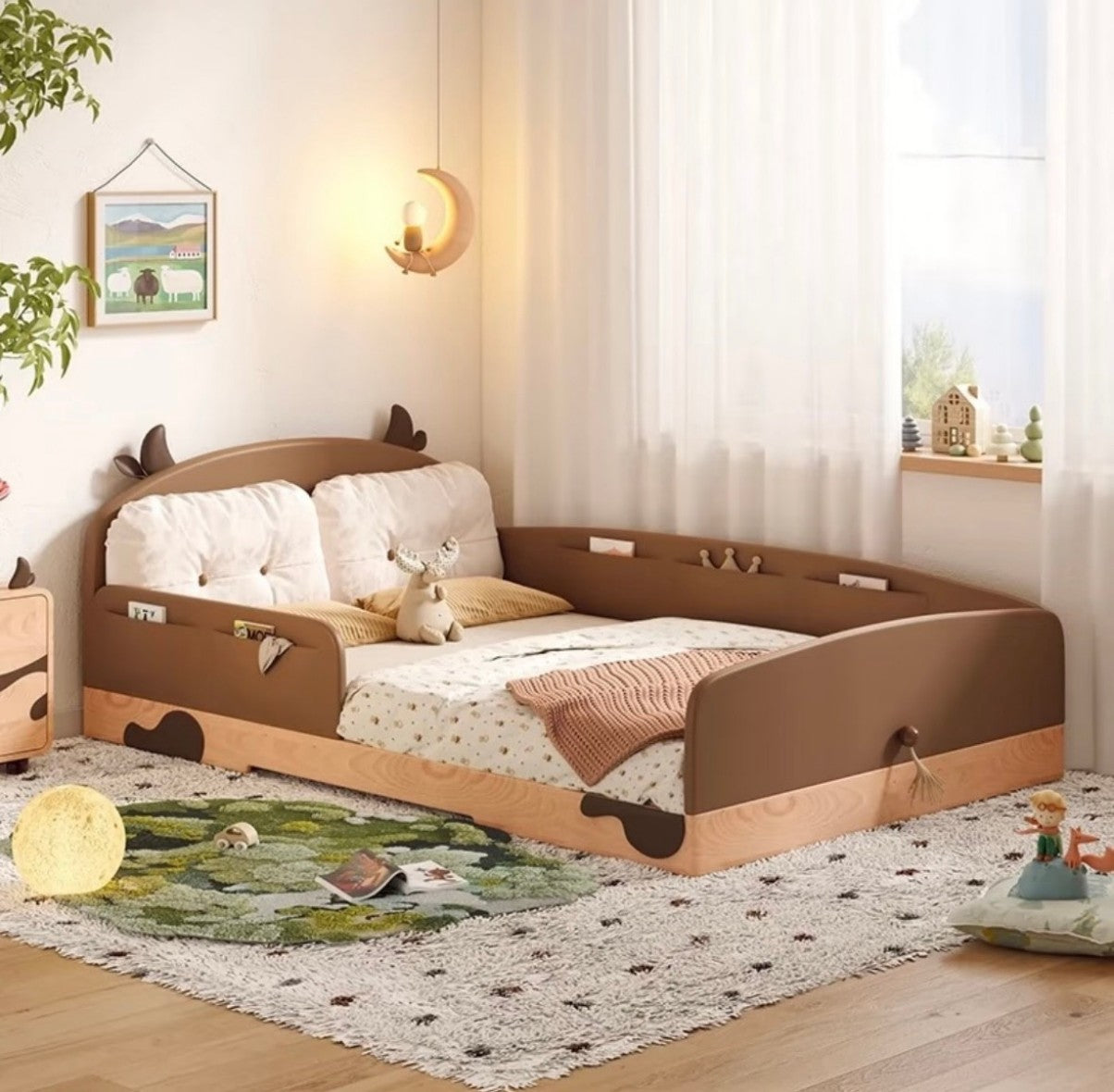 Transform your child’s room into a woodland wonderland with this Scandinavian Moose-Themed Toddler Bed, designed for both comfort and imaginative play. The inviting low-profile design ensures safe, easy access for toddlers while the surrounding guard rails provide added peace of mind for parents. Softly rounded edges and rich wood tones combine with charming antler accents and playful details, creating a nurturing space that feels both whimsical and secure. The bed’s sturdy construction and plush, supportive back pillows make it a cozy spot for reading or naptime, while thoughtful built-in storage pockets keep bedtime essentials close. Paired with a fluffy area rug and natural light, this toddler bed brings warmth, creativity, and Scandinavian style to any modern nursery or kids’ bedroom.