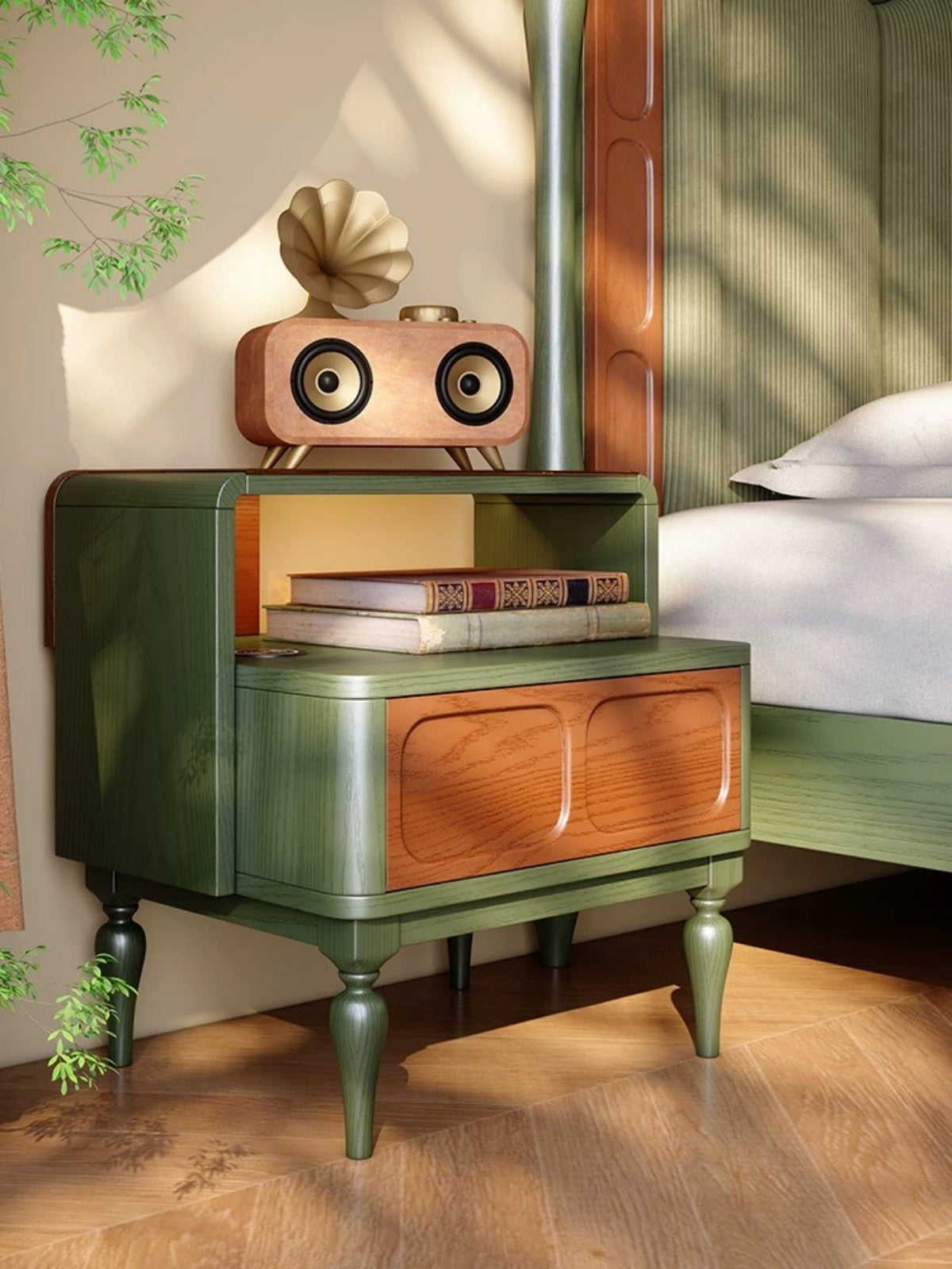 Vintage Green Bedside Table – Classic Wood Nightstand with Shelf